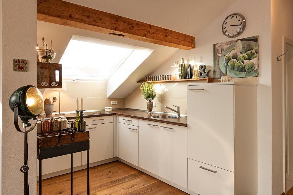 Loft: Das Haus, in welchem sich dieses Apartment befindet, ist ein altes Bauernhaus aus dem Jahr 1820. Dieses wurde mit viel Liebe 2013 kernsaniert. Die Ferienwohnung ist im zweiten Stock des Gebäudes unter dem Dach auf der Südseite, so dass Sie den ganzen Tag viel Sonne haben, welche Sie auch auf Ihrem eigenen Balkon mit einer traumhaften Aussicht genießen können. Studioapartment: Obwohl dies unsere kleinste Wohnung ist, fühlt man sich hier pudelwohl! Es ist alles vorhanden, was man für einen schönen Urlaub benötigt. Dieses Apartment befindet sich ebenfalls im renovierten Bauernhaus im zweiten Stock unter dem Dach mit Aussicht auf den Wengerer Dorfweiher. Die Einrichtung in allen Wohnungen ist eine Symbiose aus alt Hergebrachtem und schlichter Modere ohne viel Chi-Chi. Vieles birgt Geschichte und vereint sich mit Neuem zu etwas Außergewöhnlichem.