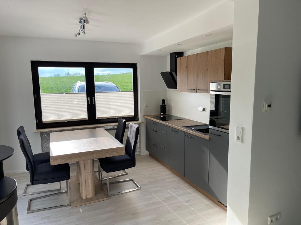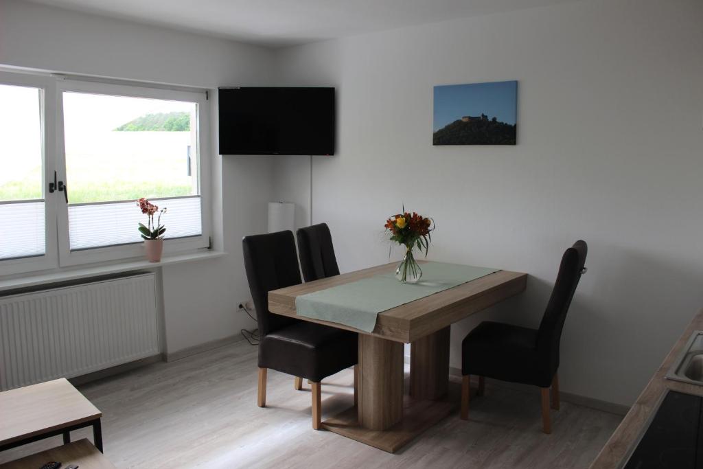 Die Ferienwohnung verfügt über einen Wohn-und Essbereich, ein kleines Bad, einen Flur sowie ein Schlafzimmer. Zu dieser Ferienwohnung gehört eine Terrasse, welche sie über den Hausflur erreichen. Im Wohn- und Essbereich, von welchem Sie einen Ausblick auf die Terrasse und die Felder haben, befindet sich eine kleine Zweisitzer Couch (auch als Schlafcouch nutzbar 1,95m*1,33m) ein Flachbildschirm, ein Essbereich sowie die dort integrierte Einbauküche. Die Einbauküche ist mit einem Kühlschrank mit Eisfach, einer Spülmaschine, einem Backofen und Cerankochfeld, einer Kaffeemaschine, einer Senseo Padmaschine, einem Wasserkocher, einem Eierkocher und einem Toaster ausgestattet. Spültücher, Küchenrolle, Geschirrspülmittel, Taps, Geschirrtücher und Müllbeutel sind vorhanden. Das Badezimmer ist mit einer Dusche, einem WC, einem Waschtisch, einem Kosmetikspiegel sowie mit einem Fön ausgestattet. Hand- und Duschtücher sowie Handseife sind vorhanden. Das Schlafzimmer verfügt über ein Boxspringbett (1,90*2,00 m) inkl. Bettwäsche und einen Kleiderschrank. Es befindet sich dort ein weiterer Flachbildfernseher mit einem Sky Receiver, Netflix ist möglich.