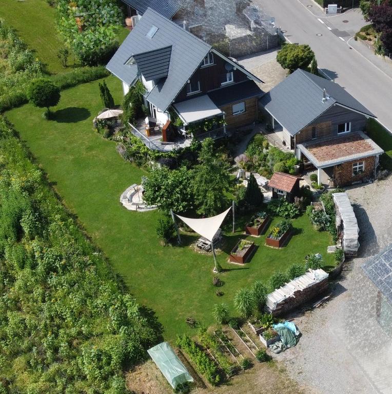 Unsere Ferienwohnung befindet sich in unserem 2009 erbauten Einfamilienhaus, in Mitten unserer Obstplantagen / Blumenwiese