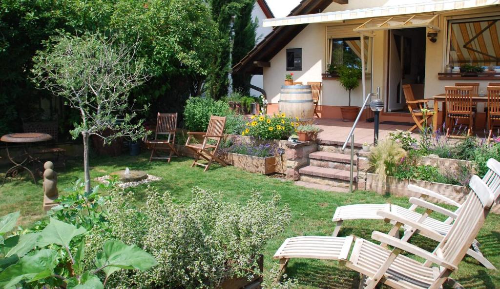 Im Frühjahr 2020 haben wir das Gartenhaus komplett neu ausgestattet und zwischenzeitlich hat sich auch im Garten einiges getan. Wir haben einen Quellstein errichtet, zwei kleine Hochbeete bepflanzt, einen Feigenbaum und zwei Johannisbeeren gesetzt. Wir würden uns freuen, wenn Sie die Kräuter aus dem Garten in der Küche verwenden. Im nächsten Jahr können Sie dann Johannisbeeren und Feigen kosten. Zudem haben wir einen zweiten „Freisitz“ eingerichtet mit Blick in die Weinberge und das Haardtgebirge. In ruhiger Lage bietet unser Gartenhaus folgende Ausstattung: Schlafzimmer: 3 jeweils mit Dusche und WC, (1 Doppelbett, 4 Einzelbetten, zusammenschieben zum Doppelbett möglich), Handtücher und Bettwäsche incl. Wohn- und Küchenbereich: mit Cerankochfeld, Mikrowelle, Spülmaschine, Kühlschrank, Kaffeevollautomat, Wasserkocher, Elektrogrill, Toaster, Eierkocher,LED-TV, WLAN, Terrasse und Garten (Südseite) mit Sitzgelegenheit. Parkplätze für bis zu 3 PKWs Garage abschließbar für Fahrräder und Motorräder