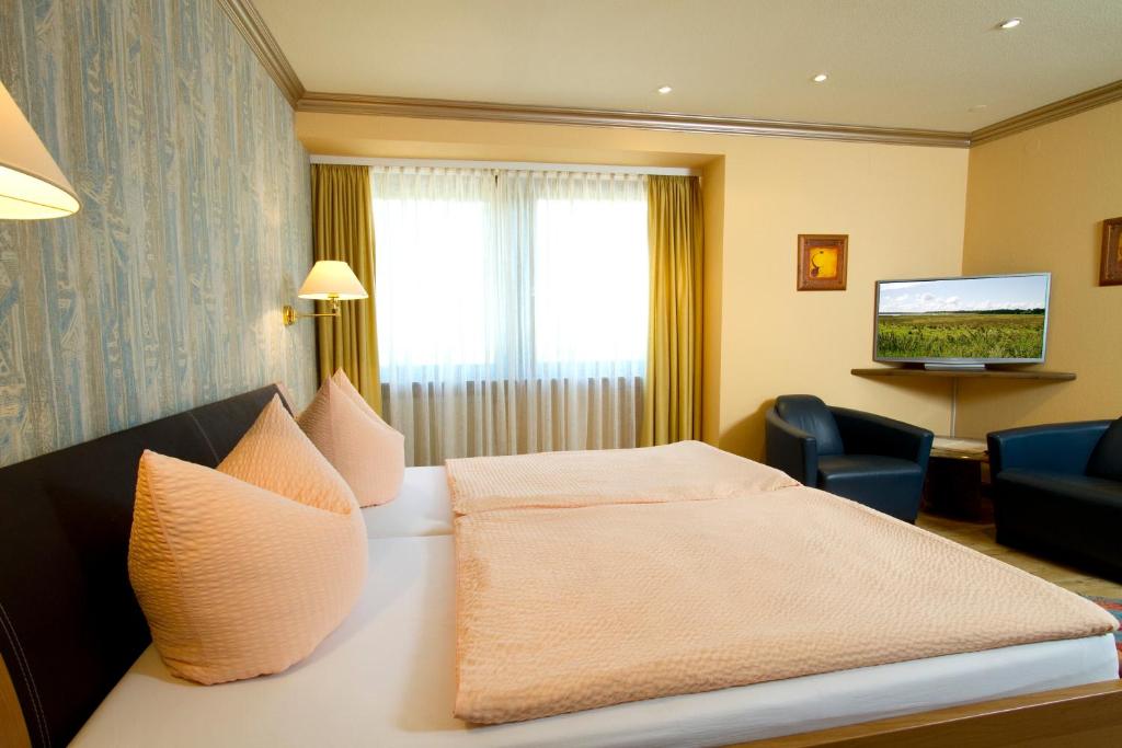Die hell und gemütlich dekorierten Zimmer im Gästehaus Hebinger am Schlosspark bieten alle einen kleinen Sitzbereich, einen Flachbild-TV und ein eigenes Bad mit Pflegeprodukten.