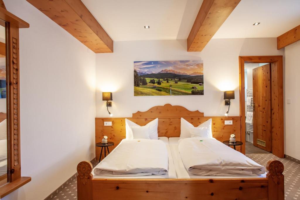 Ein Frühstücksbuffet steht morgens im reizvollen Frühstücksraum für Sie bereit, wo Sie nachmittags einen Kaffee genießen können. An sonnigen Tagen verweilen Sie auf der Terrasse, die Sie mit ihrer spektakulären Aussicht über das Karwendelgebirge begeistern wird.