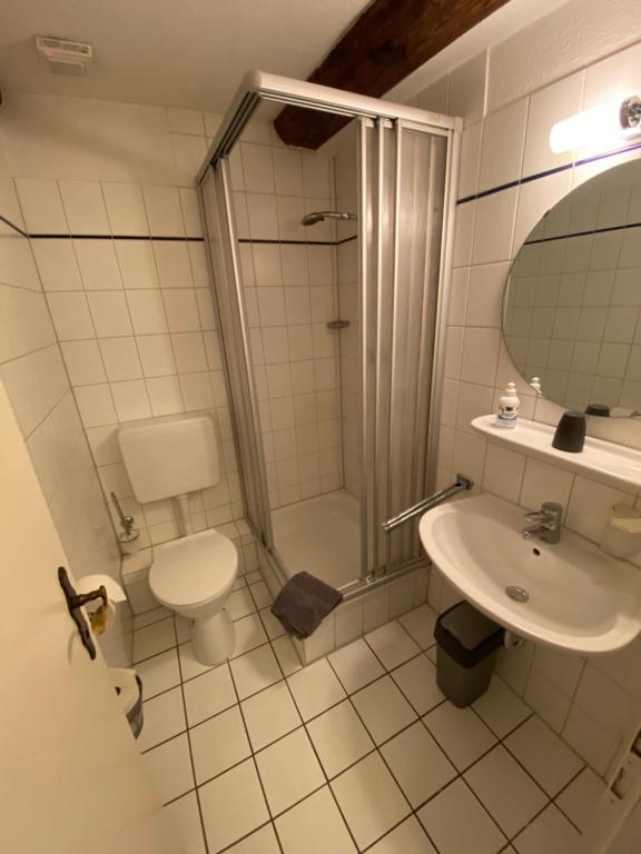 Jedes Zimmer im Gasthof verfügt über einen Kleiderschrank, einen Flachbild-TV und ein eigenes Bad.
