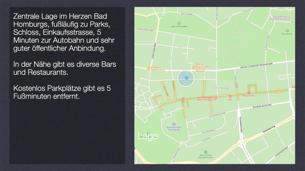 • Wie weit ist die Unterkunft Großes und helles Innenstadt Apartment - Ferienwohnung vom Zentrum von Bad Homburg vor der Höhe entfernt?