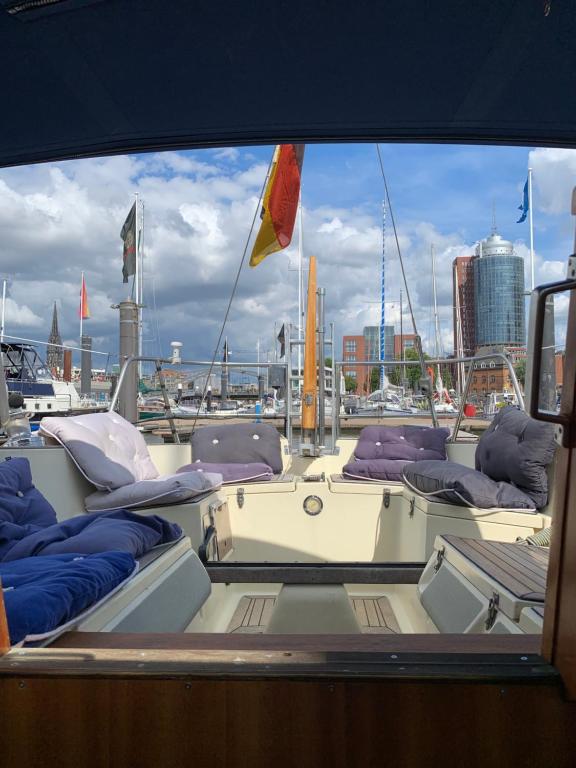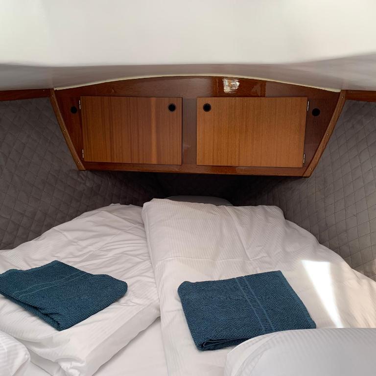 Das Boot umfasst 1 Schlafzimmer, 2 WCs, einen Sitzbereich und eine Küche mit einem Kühlschrank. Im 50 m entfernten Hafen können Sie die Badezimmereinrichtungen nutzen.