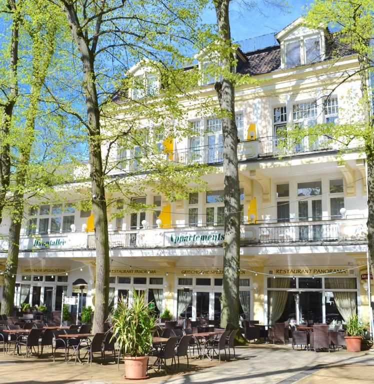 Die modern eingerichteten Appartements befinden sich in zentraler Lage unmittelbar auf der berühmten Hauptallee. Der Kurpark, der Brunnenplatz mit dem Hylligen Born, das Kurtheater, das Konzerthaus, die Fußgängerzone sowie zahlreiche Restaurants, Cafés und Einkaufsmöglichkeiten befinden sich direkt vor der Tür. Ein idealer Ausgangspunkt, um Bad Pyrmont mit seinem vielfältigen Angebot zu erkunden. Das Haus verfügt über einen rollstuhlgerechten Fahrstuhl. Im gesamten Haus steht Ihnen W-Lan zur Verfügung. Die Appartements verfügen alle über einen kombinierten Wohn-/Schlafbereich, Badezimmer mit Dusche und WC, voll ausgestattete Küchenzeile, SAT-TV, Radio, Telefon. Bei Anreise erhalten Sie die Pyrmont Plus Card, die Ihnen ein umfangreiches Freizeitprogramm garantiert. Genießen Sie z. B. täglich kostenfrei: 1,5 h Hufeland Therme Freizeitbad Pyrmonter Welle Eintritt Museum im Schloss 2 h E-Bike fahren Stadtbusverkehr sowie täglich 3 verschiedene Gesundheitskurse (Yoga, Pilates uvm.) die Sie ohne Anmeldung kostenfrei ausprobieren können.