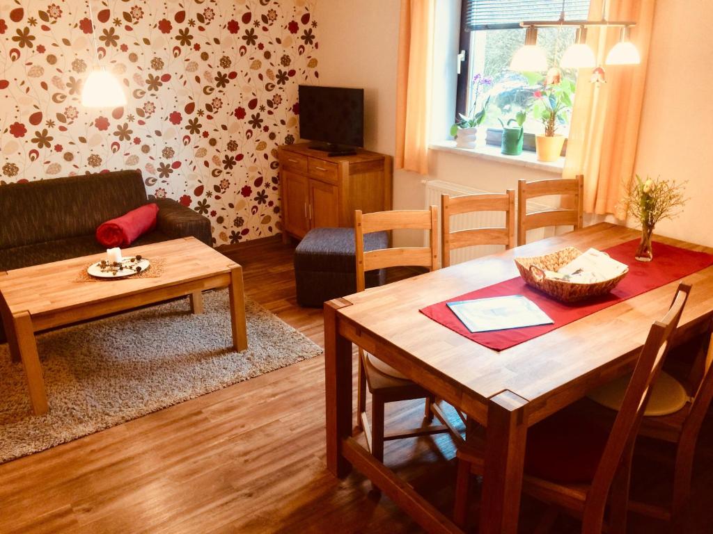 Unsere Ferienwohnung befindet sich in der unteren Etage unseres Hauses mit seperatem Eingang. Sie hat zwei getrennte Schlafzimmer ( 2 und 4 Betten) und ein geräumiges Bad mit zwei Waschbecken, Dusche und WC. Im Wohn, Ess und Küchenbereich gibt es eine Fußbodenheizung. Die neue Einbauküche ist mit Geschirrspüler ausgestattet, Bettwäsche und Handtücher sind im Preis inbegriffen. Nutzen Sie kostenloses WLAN Im Sommer können Sie im Garten sitzen, ein Grill ist vorhanden. Für ein leckeres Frühstück haben Sie die Möglichkeit von unserer bunten Hühnerherde legefrische Eier zu erwerben sowie den Brötchenservice von dem im Ort ansässigen Cafe 'Rotter ' zu nutzen. ( Bestell und Preisliste liegt in unserer Ferienwohnung aus.)