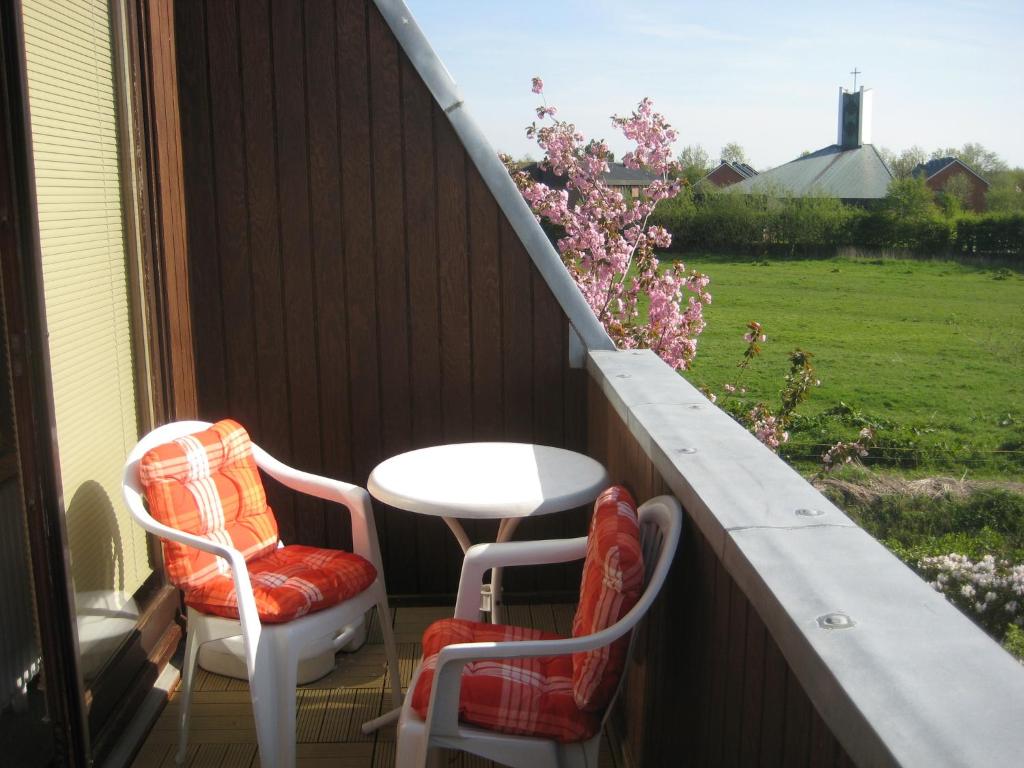 Nichtraucherhaus. Die Ferienwohnung liegt in der 1. Etage eines Einfamilienhauses in ruhiger Lage. Vom Balkon geniessen Sie den Blück über Gärten und Weiden. Nichtraucherwohnung für bis zu 6 Personen mit 2 Schlafzimmern und Balkonloggia. Wohnraum mit Sitzgruppe 3-2-1, Doppelbettcouch, Flachbildfernseher, Schranktresor 1. Schlafraum mit Doppelbett, Kinder-Gitterbett und Kleiderschrank 2. Schlafraum mit 2 Einzelbetten (90x200) und Kommode Separate Küche mit Ceran-Kochfeld/4Kochstellen, Geschirrspüler, Mikrowelle, Kaffemaschine, Toaster, Radio und Eßtisch. Geschirr und Hausrat in ausreichender Anzahl ist selbstverständlich Duschbad/WC mit Tageslicht Balkonloggia mit Tisch und Stühlen WLAN Internetanschluß Bettwäsche, Hand-/Duschtücher, Strandtücher und Geschirrtücher werden als Wäschepaket gestellt