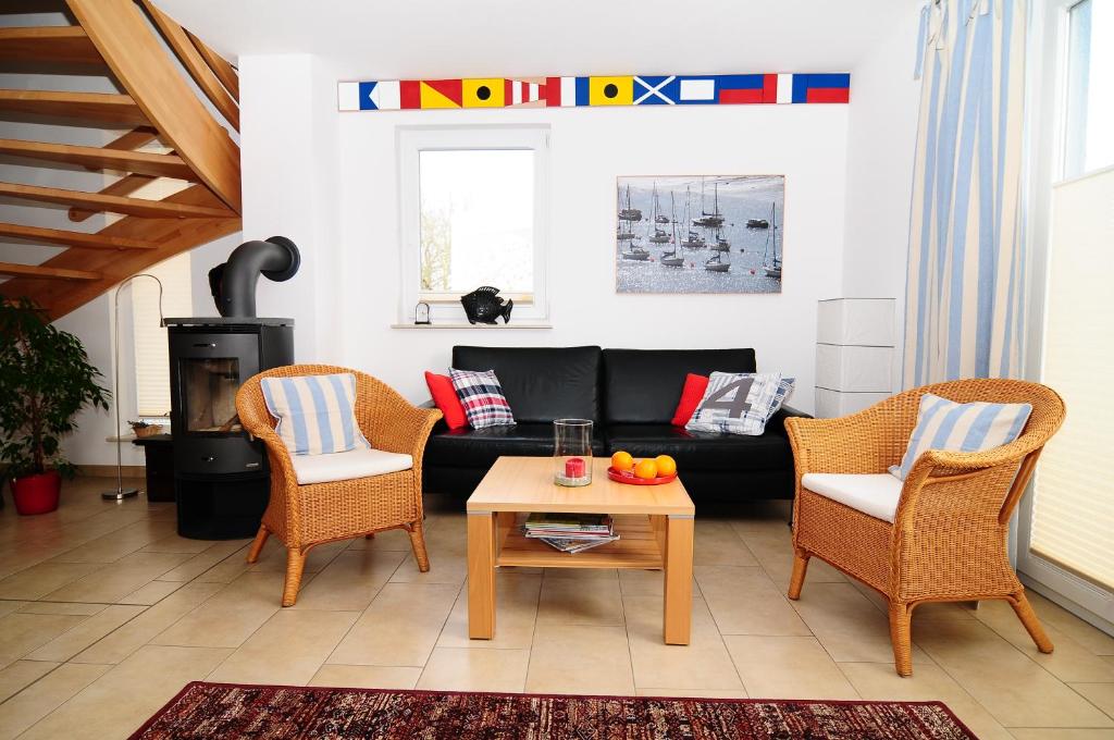 Inmitten der Natur der Rügenschen Boddenlandschaft finden Sie hier Erholung abseits vom Massentourismus. Unser Haus liegt am Rand des Hafendorfes mit Blick auf den Breetzer Bodden und den Yachthafen. Ein Kaminofen und die Fußbodenheizung sorgen für eine behagliche Atmosphäre an kalten Tagen. In der oberen Etage sind neben dem Bad und der Sauna 2 Schlafräume mit Boxspringbetten (ein Doppelbett und 2 Einzelbetten) vorhanden. Im Wohnbereich der unteren Etage befindet sich die offene Küche. Sie ist komplett ausgestattet und bietet all die Annehmlichkeiten, die Sie auch von zu Hause gewohnt sind (Ceranfeld/Backofen, Kühlschrank mit Gefrierfach, Wasserkocher, Toaster, Mikrowelle, Jura-Kaffeautomat, Milchaufschäumer, Geschirrspüler, Raclette...) Ebenfalls im Erdgeschoss befindet sich ein zweites Bad mit Dusche, WC und die Waschmaschine. Auf der Terrasse gibt es einen Strandkorb. Weitere Terrassenmöbel / Aufleger sowie einen elektrischen Grill finden Sie im Nebengebäude. Für Familien mit kleinen Kindern gibt es ein Babybett und einen Hochstuhl. Unser Haus ist ein Nichtraucherhaus. Tiere sind nicht gestattet. Dadurch ist es auch für Allergiker geeignet.