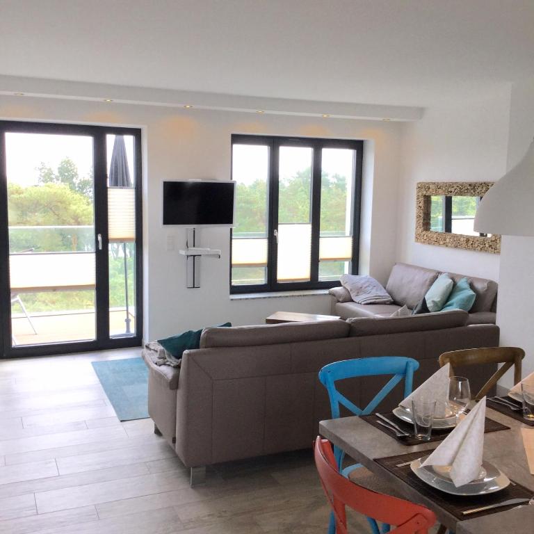 Höher weiter schöner… Ganz oben 5. OG mit Blick auf die Ostsee bis Sassnitz, Hafen von Mukran und teile der Kreidefelsen. Aufwachen und jeden Morgen den Sonnenaufgang über dem Meer genießen, vielleicht bei einem Kaffee im Bett? Nach dem Aufstehen zuerst in die erfrischende Ostsee springen, um danach ein ausgedehntes Frühstück auf dem Balkon zu genießen. Strand vor der Tür. Freuen Sie sich auf viele attraktive Angebote der Umgebung wie den Baumwipfelpfad, den Seilgarten Prora, Karls Erdbeerkinderhof, Fußball, Basketball, Schwimmbad, NVA - Museum, Varietee und zahlreiche Restaurants.