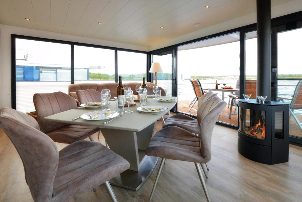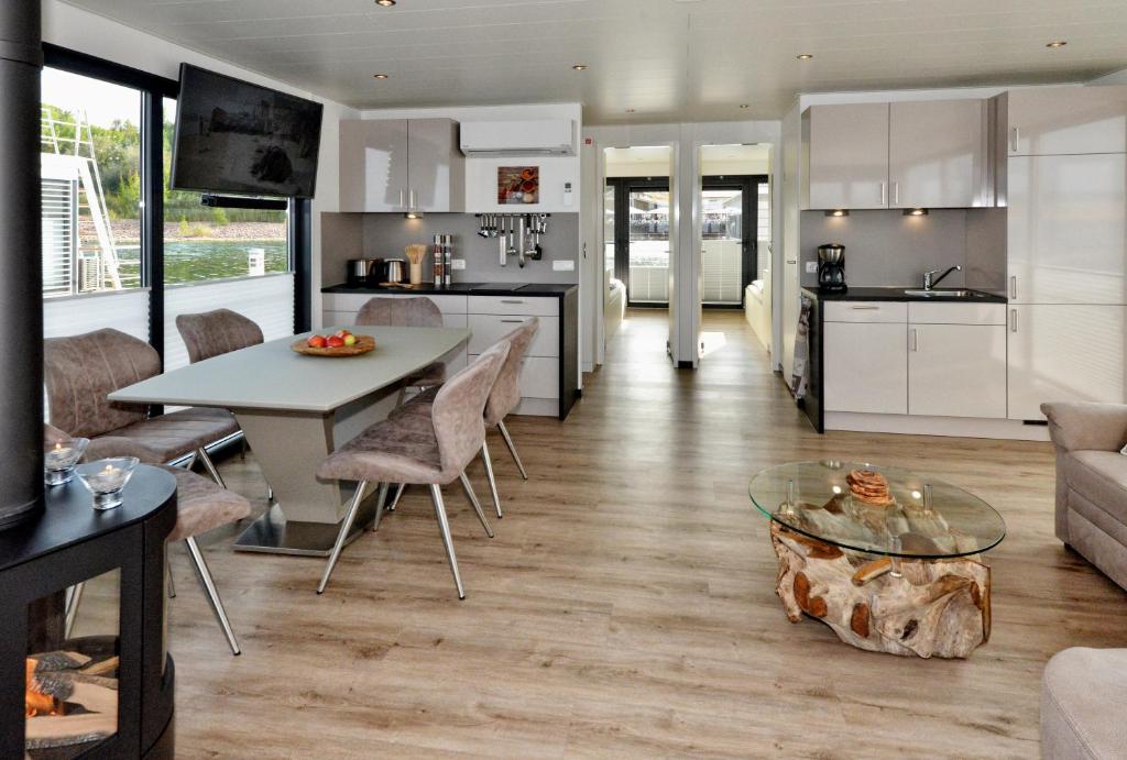 Das Hausboot No. 5 "Treibholz" in Mücheln bietet ein Restaurant, Grillmöglichkeiten und eine Terrasse. Die klimatisierte Unterkunft liegt 11 km von Freyburg entfernt.