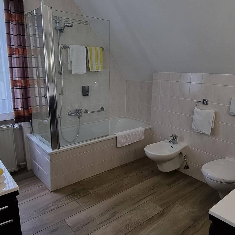 Die hellen Zimmer im Hotel Rhöner Land Garni - Bed & Breakfast verfügen über einen Flachbild-TV mit kostenfreien Sky-Kanälen und ein geräumiges Badezimmer.