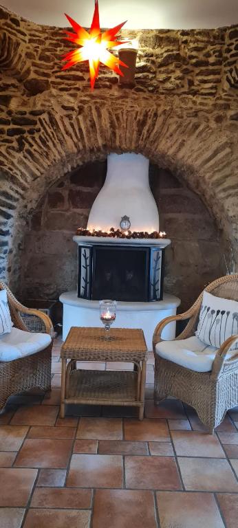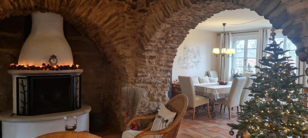 Mitten in Ihrem 5 Sterne Ferienhaus befindet sich der riesige, offene Kochbereich der alten Klosterküche. Das Mauerwerk ist aus dem 13. Jahrhundert und mündet in einer großen Esse die oben aus dem Dach herausschaut. Sie ist eines der weithin sichtbaren Wahrzeichen des Münzenberges. Heute befindet sich hier ein romantischer, offener Kamin an dessen knisterndem Feuer Sie im Winter gemütliche Stunden verbringen können. Das ganze Haus ist um den großen Schornstein herum erbaut wurden. In Ihrem großzügigen und modern ausgestatteten Ferienhaus verbringen Sie Ihren Urlaub inmitten uralter deutscher Geschichte.