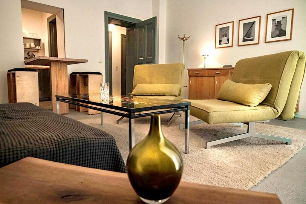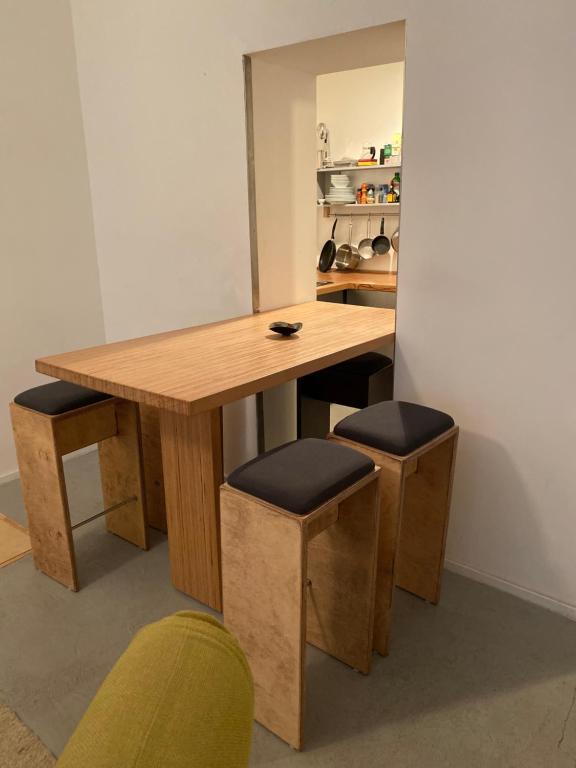 Ein Wohnzimmer mit einem Schlafsofa und zwei großen Sesseln, die sich in Betten verwandeln lassen. Ein sehr ruhiges Schlafzimmer zum Hinterhof mit angeschlossenem Badezimmer sowie ein zusätzliches Gäste WC mit großem Spiegel. Besonders interessant für vier Gäste: Die Wohnung verfügt über zwei separate Eingänge, die das Betreten und Verlassen ermöglichen, ohne die anderen zu stören. Die Edelstahlküche ist über eine offene Theke mit dem Wohnzimmer verbunden.