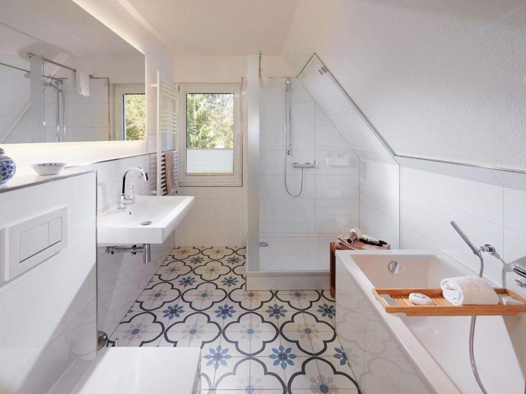 Zwei Schlafräume verfügen zusätzlich über ein Smart-TV (SAT). Ein neues Badezimmer befindet sich im Erdgeschoss. Eine extra große, barrierefreie Dusche sowie zwei freistehende Waschbecken, ein WC und stilvolle Akzente lassen keine Wünsche offen. Das zweite neue Badezimmer im Obergeschoss verfügt über Badewanne, Dusche, WC und ein großes Waschbecken. Die modernen Armaturen gepaart mit dem nostalgischen Fliesenboden laden zum Wohlfühlen ein. Ein Handtuchheizkörper, großer Wandspiegel und Fön runden dieses Bad ab. Im Preis inbegriffen sind WLAN, Bettwäsche, Bade- und Handtücher sowie Strom- und Heizkosten. Außerdem drei Autostellplätze und ein Carport für Zweiräder.