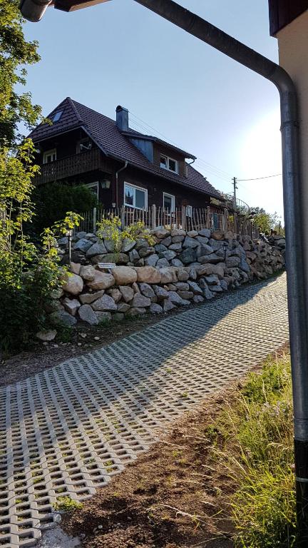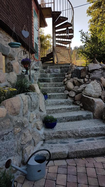Die Ferienwohnung liegt ausserhalb von Blasiwald und ist ein Teilort von Schluchsee. Die Ferienwohnung ist verwinkelt und urgemütlich eingrichtet.Und dennoch für Gäste ,die lieber ihre Zeit aktiv in der Natur unterwegs sind,als die Zeit "abwohnen" und den Tag verschlafen. Die Ferienwohnung wird über eine Wendeltreppe mit eigenem Eingang erreicht .Also nicht Rollstuhl.-Behindertengerecht. Man gelangt vom Eingang mit der grossen Terrasse direkt in die gemütliche Küche. Diese ist komplett ausgestattet! Also Filterkaffemaschine, Wasserkocher,Kühl.-Gefrierkombination, grosse Spühlmaschine, Toaster und Minibackofen. Das Wohnzimmer verfügt über ein Sat-TV und ein Boxspringschlafsofa. Es könnten somit auch 4 Personen in der Ferienwohnung übernachten! Das grosse Bad hat ein Waschtisch,Badewanne,Dusche und ein WC. Das Schlafzimmer hat über 23 Qm2 , hat ein grosses Balkenbett ( 200x220) genügend Stauraum für Ihre Kleider. Dazu gibt es eine kleine Leseecke und direkten Zugang zum Balkon. Das Schlafzimmer kann in den kalten Jahreszeiten mit dem Schwedenofen beheizt werden. Auf der großen Terrasse steht ein Holzkohlegrill für die gemütlichen Abendstunden ganz allein für Sie bereit.