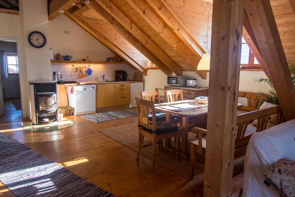 Im neuen Dachgeschoss haben wir eine großzügige Ferienwohnung (80 m²) mit offenem Dachstuhl eingerichtet. Der gemütliche Wohnraum mit Kaminofen bietet einen einladenden Sitz-, Ess- und Arbeitsbereich. Die Küchenzeile ist mit Doppel-Induktionskochfeld, Kapselmaschine (Expressi) mit einigen Kaffekapseln, Mikrowelle mit Grill- und Backfunktion, Geschirrspüler sowie Kühlschrank mit kleinem 3-Stern-Gefrierfach ausgestattet. Zwei Schlafzimmer mit Doppelbetten und einem Einzelbett laden unter den hölzernen Dachschrägen zum geruhsamen Schlaf ein. Bettwäsche und Handtücher sind selbstverständlich vorhanden. Vom Balkon hat man einen weiten Blick über das Murnauer Moos bis hin zur Zugspitze. Für die kurze Fahrt in den Ort stellen wir Fahrräder zur Verfügung, aber auch unsere Bushaltestelle “Hechendorf Mitte” liegt direkt vor der Tür. Die Unfallklinik befindet sich in der Nähe. Als Kunsthistorikerin biete ich Ihnen gerne Orts- und Museumsführungen in Murnau und Umgebung an.