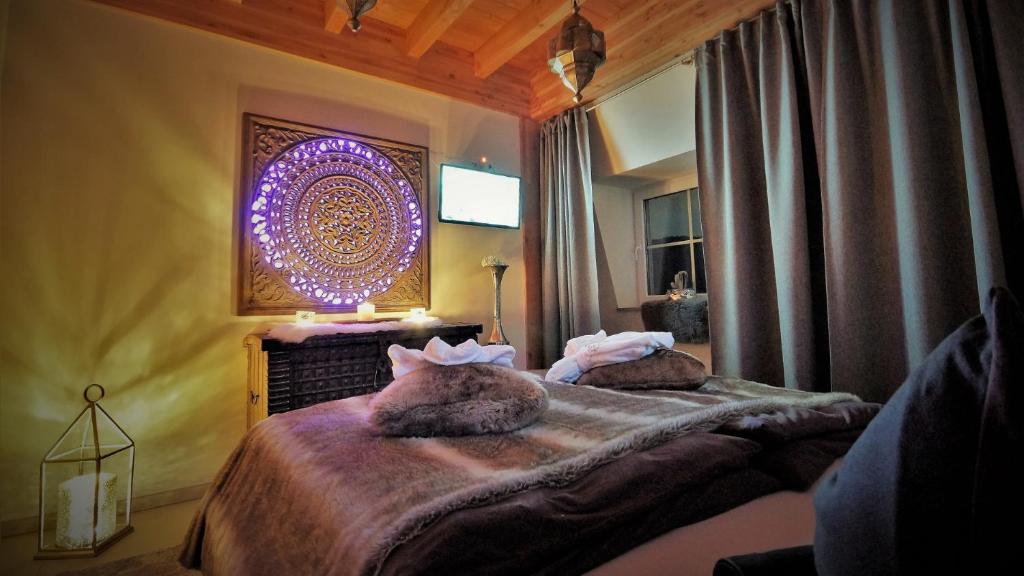 Die Müllerthal Suite ist Luxuriös und sehr geschmackvoll eingerichtet. Im Wohn und Essbereich erwartet euch eine Kombination aus edlem Chrom und Altholz. Dieser Mix und die wundervollen Dekorationen schaffen ein Luxuriöses und doch sehr gemütliches Wohlfühlambiente. Das bequeme Sofa ist euer Kuschelplatz für entspannte Zweisamkeit und der beste Sitzplatz für eurer ganz privates Kino. Der Balkon lädt zum draußen Essen und Frühstücken ein und hat ein traumhaften Panoramablick ins Tal und auf dem Wald. Raucher können sich hier ganz entspannt zurücklehnen auch bei Regen denn der Balkon ist überdacht. Die kompakte aber voll ausgestattete Küche verfügt über alles was Ihr benötigt um euch ein leckeres Romantikdinner zuzubereiten. Das Schlafzimmer ist ein echtes Highlight und sorgt für Orientalische Romantikstimmung. Der Flachbildfernseher verfügt über ein DVD Player und Sat TV. Hinter der Altholzwand ist ausreichend platz für Gepäck und eure Garderobe. Das Lichtkonzept mit modernster LED Technik und Orientalisch Handgearbeiteten Hängelampen sowie Antike Möbel, traumhafte Deko und flackernder Kerzenschein schaffen ein Wohlfühlambiente welche nur schwer in Worte und Bilder zu fassen sind