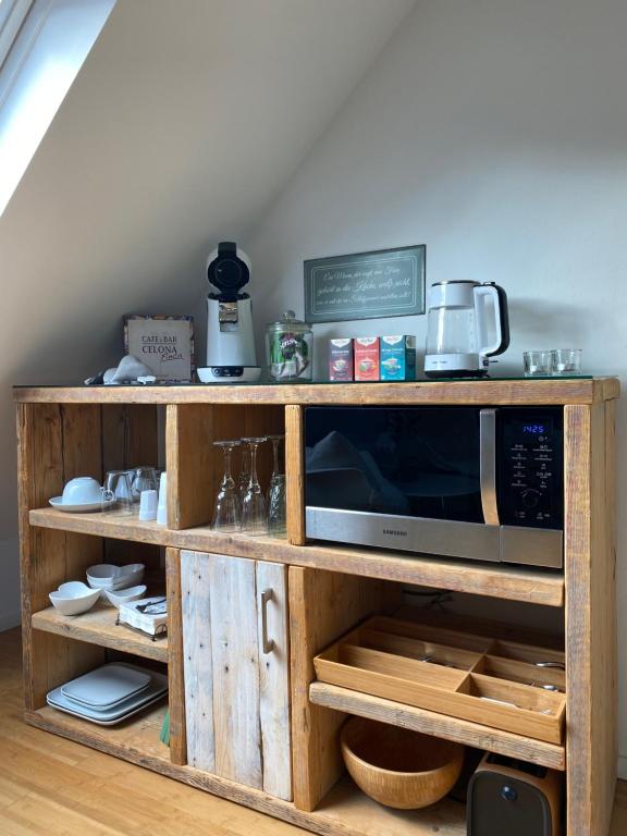 Eine kostenfreie Minibar mit Sekt, Wein und ein paar kleinen Süßigkeiten ist ebenfalls vorhanden. Eine Kaffeemaschine und ein Mini-Backofen sind ebenfalls vorhanden.