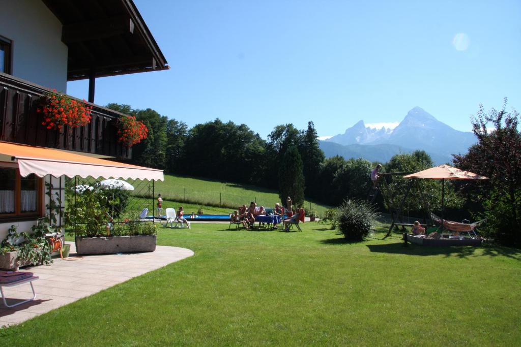Unser Haus liegt abseits von Straßenlärm mit einem einmaligen unverbauten Rundumblick auf die Berge.Unser großer Garten ist uneinsehbar mit Postkartenblick auf den Watzmann.
