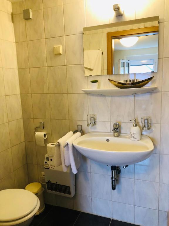 Die hellen Zimmer in der Pension Holzgarten verfügen über einen Schreibtisch und ein eigenes Bad. Parkett und Holzmöbel sind in allen Bereichen vorhanden.