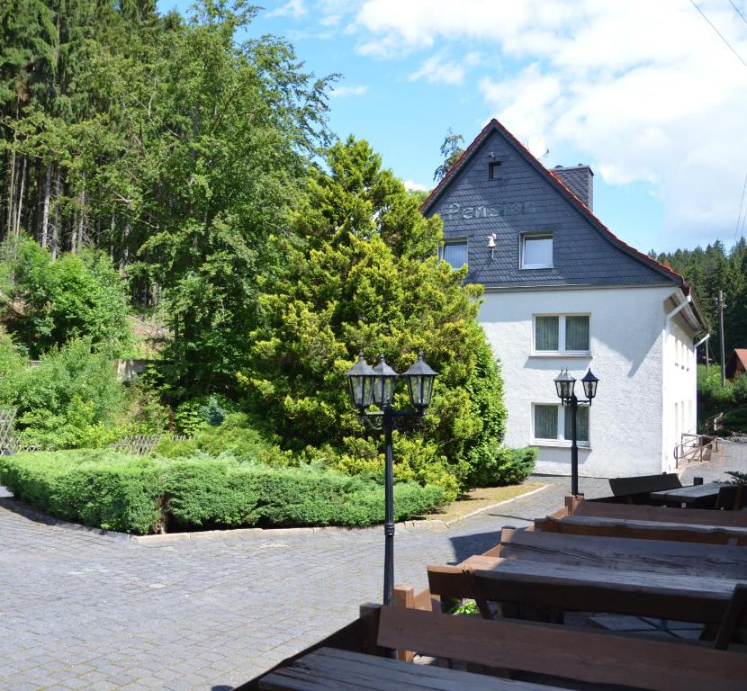 Direkt am Waldessaum gelegen, bieten wir Ihnen alles, was Ihren Aufenthalt, zu einem angenehmen Erlebnis werden lässt. Unser Haus befindet sich unweit des Rennsteiges und ist ein günstiger Ausgangspunkt für größere und kleinere Wanderungen. Gern informieren wir Sie vor Ort über aktuelle Veranstaltungen und gut ausgezeichnete Wanderwege. Unsere 15 ruhigen, geräumigen Nichtraucherzimmer im Pensionsgebäude sind mit DU/WC, Telefon und LCD-TV ausgestattet. Für die Zeit Ihres Aufenthalts steht Ihnen ein kostenloser Parkplatz direkt am Haus zur Verfügung.