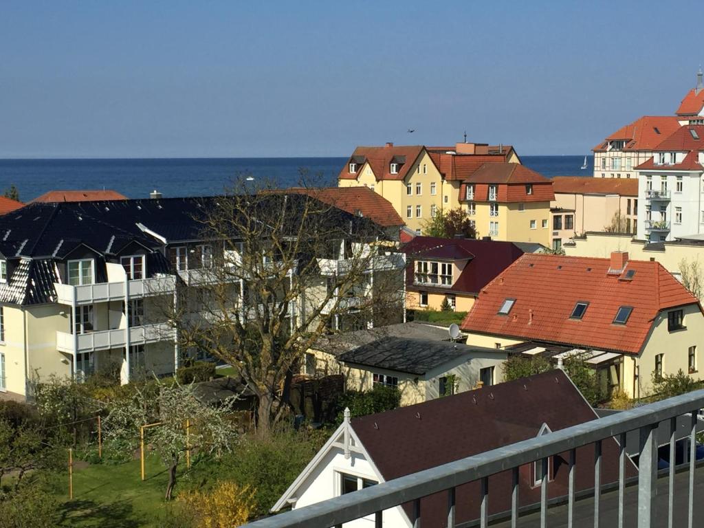 Licht- und sonnendurchflutete Ferienwohnung für 2-6 Personen auf zwei Ebenen mit MEERBLICK und 33 qm großer DACHTERRASSE auf dem Dach der RESIDENZ-SEESTERN in Kühlungsborn West, nur 200 m von Promenade, Strand und Baltic-Platz und 100 m von der beliebten Bummelmeile Unter den Kolonnaden entfernt. Diese 3-Zi-Ferienwohnung im PENTHOUSE-Stil bietet einen wunderschönen Weitblick auf Meer, Ort und den Bastorfer Leuchtturm und besteht aus Wohnbereich mit bequemer Schlafcouch, Küchen- und Eßbereich, 2 Schlafzimmern mit Doppelbett, 2 kompletten Bädern mit Dusche/WC und Fenstern sowie 33 qm großer Dachterrasse. Mit einer Größe von 80 qm ist die Wohnung ideal geeignet für bis zu 5 oder 6 Personen. Ihr Auto parken Sie bequem auf dem eigenen Einstellplatz direkt am Haus. Alle Einkaufsmöglichkeiten in unmittelbarem Umfeld! Besonderheiten: Ruhige Lage "über den Dächern von Kühlungsborn", mit Meerblick und großer Dachterrasse. Sicherlich stellt diese Wohnung etwas ganz Besonderes dar! Im Haus befindet sich eine attraktive SAUNA, die von den Gästen der SEESTERN-Residenz (gegen Gebühr) jederzeit genutzt werden kann.