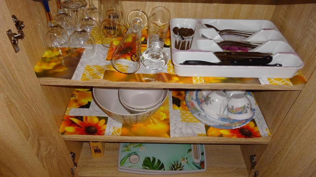 Eine Mikrowelle und ein Wasserkocher sind ebenfalls vorhanden.