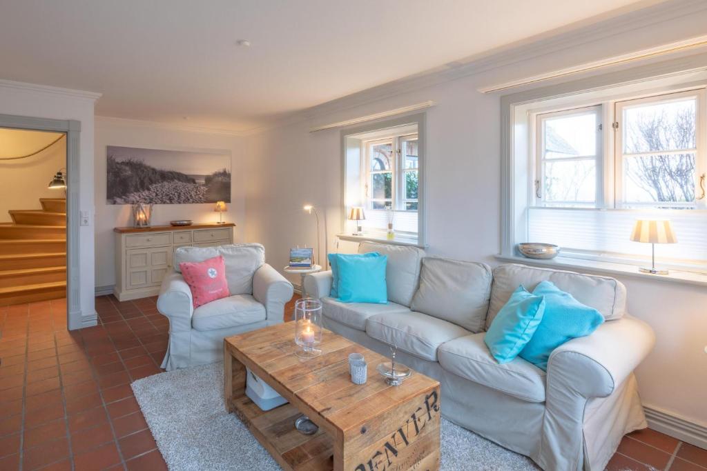 Herzlich Willkommen im "Reethus Hans" in Husum-Hockensbüll. Genießen Sie in unserem exklusiven, ruhig gelegenen Ferienhaus das Ambiente unter Reet mit Blick auf den Husumer Deich! Das Haus (Haushälfte mit ca. 85 qm Wohnfläche) eignet sich für 1 bis 4 Personen. Es bietet zwei Schlafzimmer und ein Dusch- und Wannenbad im OG. Die Schlafzimmer (Schlafzimmer 1 mit Doppelbett, Schlafzimmer 2 mit zwei Einzelbetten) sind bei Ankunft liebevoll bezogen. Im EG finden Sie die komfortabel eingerichtete Küche mit Herd, Backofen, Kühlschrank, Mikrowelle, Waschmaschine/Trockner, Toaster, Wasserkocher, Filterkaffeemaschine (Filtergröße 4), ein Badezimmer mit WC und Dusche. Das gesamte Erdgeschoss wird über eine Fußbodenheizung erwärmt. Über das Wohnzimmer, in dem für Sie neben einer gemütlichen Sitzeecke ein großer Flachbildschirm und eine Sonos-Musikanlage bereit steht, gelangen Sie zur geschützten Terrasse, die mit einem Weber-Kugelgrill und hochwertigen Gartenmöbeln ausgestattet ist. Zum Haus gehört ein Kfz-Stellplatz. Ihre Fahrräder können Sie in einem kleinen Unterstand geschützt abstellen.