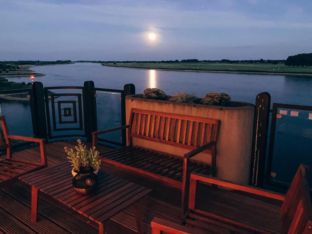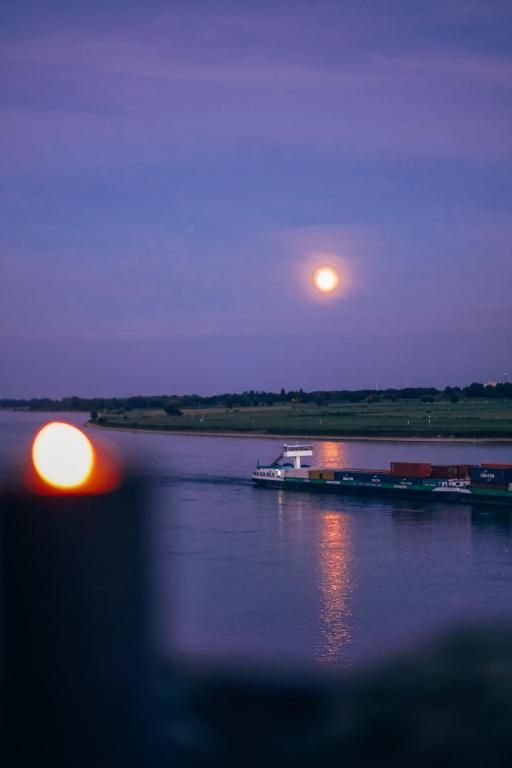 Vollausgestattet und mit Charme eingerichtet ist das Apartment über den Dächern der Emmericher Rheinpromenade der ideale Ort für Urlaub am Niederrhein. Die Maisonettewohnung liegt im obersten Stockwerk direkt über der Rheinpromenade. Hoch genug, um vom regen Treiben am Flussufer nur dann etwas mitzubekommen, wenn man sich etwas über eines der Balkongeländer lehnt und nach unten sieht. Hebt man den Blick, wandern die Augen entlang des mäandernden Rheins und man läuft Gefahr seine Gedanken in der endlosen Weite der niederrheinischen Landschaft zu verlieren. Der eine fühlt sich inspiriert und wird mit dem Fahrrad die Gegend erkunden wollen, der andere ist hungrig vom vielen Denken und möchte lieber ein Eis auf der Promenade genießen. Beide können den Aufzug nehmen.