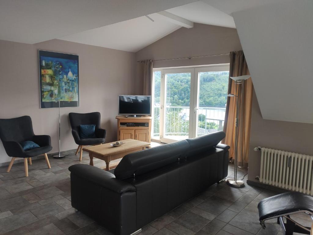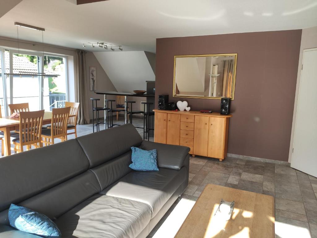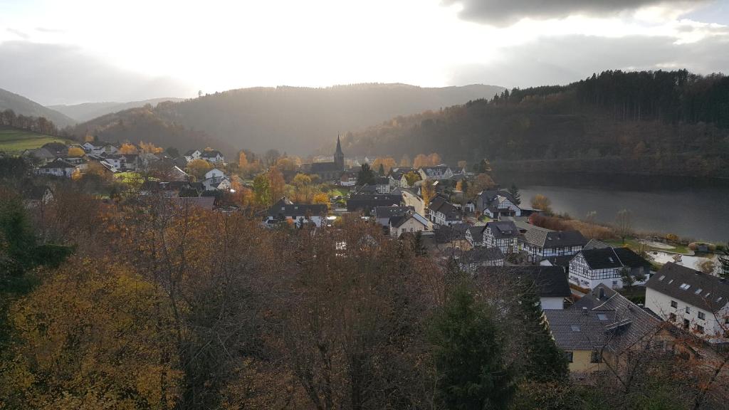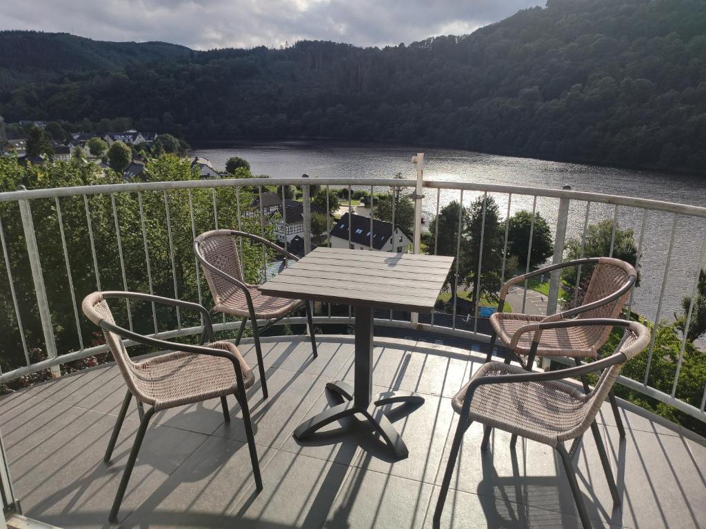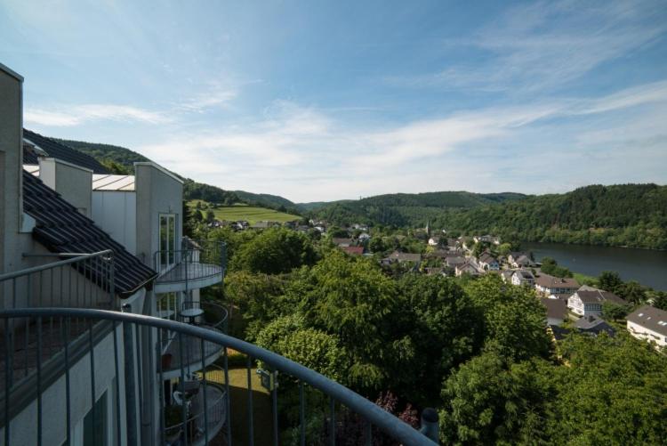 Verbringen Sie Ihren Urlaub hoch über den Dächern des Ferienorts Einruhr - mit traumhaftem Panoramablick auf den Rursee und mit direktem Einstieg in die Wanderwege des Nationalparks Eifel. Dazu bieten wir Ihnen eine Ferienwohnung in sehr ruhiger Lage und gehobener Qualität. Die Wohnung ist in südwestlicher Lage auf das Rurtal ausgerichtet. Mit einer bodentiefen Fensterfront und 3 Balkons talseitig - ein großer und 2 Minibalkons - wird die Wohnung ihrer attraktiven Lage auch architektonisch gerecht. Die bilderbuchhafte Aussicht auf den Rursee tief unterhalb Ihrer Sitzgruppe bietet Ihnen eine Atmosphäre, die Sie überraschen wird. Nicht zu vergessen der Blick auf die Mittelgebirgslandschaft der Eifel mit unterschiedlichem Kleid zu jeder Jahreszeit. Bei turbulentem Wetter können Sie das Schauspiel gleitender Vögel unter tiefen Wolken und einer vom böigen Wind aufgepeitschten Wasseroberfläche erleben. Der Blick auf die Winterlandschaft des Rurtals sollte nicht unerwähnt bleiben. Der Wildnistrail des Nationalparks führt direkt am Ferienhaus vorbei, der Eifelsteig ist fußläufig in etwa 5 Minuten zu erreichen.