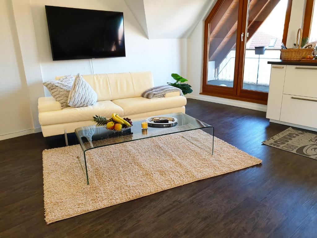Schöne und moderne 2-Zimmer-Dachgeschoss-Wohnung mit Balkon sowie Internet/WLAN in Meersburg am wunderschönen Bodensee. Die Ferienwohnung "Seeperle 4" verfügt über ein Schlafzimmer mit einem Doppelbett (180 cm x 200 cm), einen 55-Zoll-LED-Fernseher, eine moderne Küche (Kaffeemaschine, Kühlschrank mit Gefrierfach, Spülmaschine, Backofen, Ceran-Kochfeld, Dunstabzug, Toaster, Wasserkocher, Besteck, Geschirr, Töpfe, Pfannen, etc.), Internet/WLAN, Fußbodenheizung, Waschtrockner, Fön sowie Bettwäsche und Handtücher. Kostenfreie Parkplätze für Ihr Auto bzw. Fahrräder stehen Ihnen vor dem Haus sowie auf einem wohnungseigenen Privatparkplatz in der Tiefgarage zur Verfügung. Die Wohnung kann mit maximal 4 Personen belegt werden. Für die 3. und 4. Person würde ein mobiles Gästebett zur Verfügung stehen – ideal ist eine Belegung für 2 Personen.