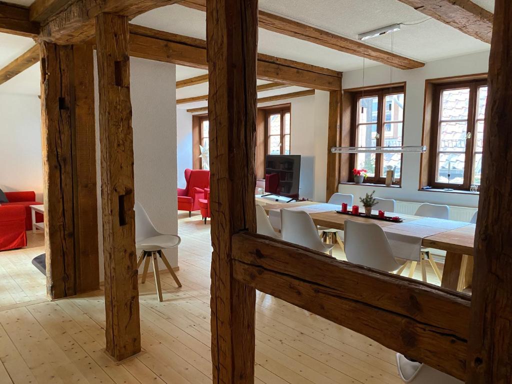 Liebe Gäste, das Ferienhaus Stieg 1 ist ein denkmalgeschütztes Fachwerkhaus, das 1664 durch den Quedlinburger Zimmermeister Andreas Bock erbaut wurde (mehr dazu unter Wikipedia). Trotz umfassender Sanierungsarbeiten ist die Charakteristik eines Fachwerkhauses erhalten geblieben. Im Innenbereich können Sie die ursprüngliche Zimmeraufteilung anhand des Gebälks erkennen. Das Haus besteht aus zwei Ferienwohnungen. Die kleinere Wohnung (30 qm) befindet sich im Erdgeschoss und ist momentan noch nicht verfügbar. Die zweite, 140 qm große Wohnung, erstreckt sich über zwei Etagen. Das 1. OG besteht aus einem großen Raum, der Essbereich, Wohnzimmer mit Schlafsofa, TV, Spielbereich und Küche abdeckt. Dort befindet sich auch das erste Badezimmer mit Dusche. Im 2. OG befinden sich die vier Schlafzimmer, die jeweils mit Doppelbett (180 x 200 cm), Schrank, Standspiegel und Kommode ausgestattet sind. Beachten Sie bitte, dass das auf dem Grundriss markierte Schlafzimmer 3 nur über das Schlafzimmer 2 betreten werden kann. Vom Flur abgehend steht Ihnen auch hier ein Bad mit Dusche zur Verfügung. Eine Terrasse mit Grill ist ebenfalls vorhanden.