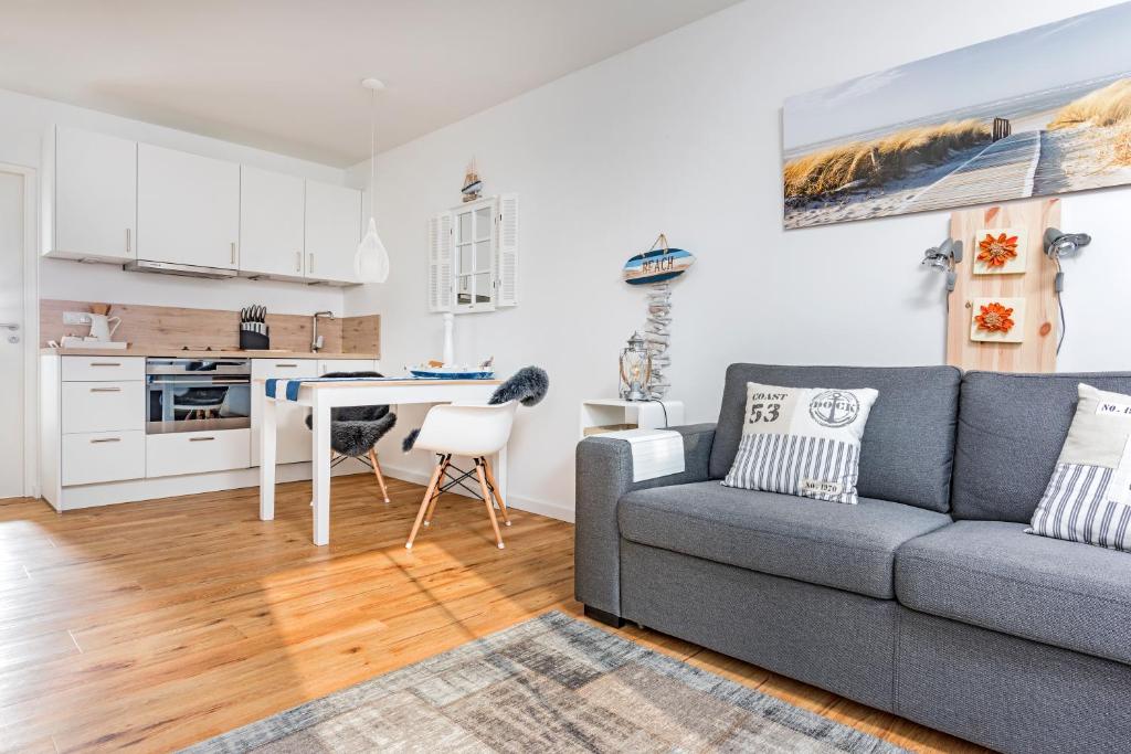 Unsere moderne 2017 erbaute Ferienwohnung Kleine Perle liegt direkt an der Nordsee, am Deich an der Perlebucht. Sie ist modern und stilvollen eingerichtet und läßt keine Wünsche offen. Auf der Terrasse in Südausrichtung kann man nach dem Frühstück genussvoll in den Sonnenliegen entspannen und die Schirme der Kiter beobachten. Ein kostenloser Parktplatz befindet sich direkt vor der Tür, ebenso Unterstellplätze für Fahrräder. Die Ferienwohnung ist 39 qm groß und befindet sich im Erdgeschoss, ist leicht zugänglich und hat eine große Sonnenterrasse. Sollte das Wetter mal nicht mitspielen, lädt nicht nur die Loungeecke als Ruhezone zum Entspannen ein. Eine Coffeebar, dimmbares stimmungsvolles Licht, eine Nespresso -und eine Filterkaffeemaschine sowie eine vollausgestatteter Küchenzeile mit gemütlichem Essplatz in modernem Ambiente , lassen keine Wünsche offen. Das Schlafsofa mit Lattenrost in Dauerschläferqualität lässt sich für mehr Raum schnell einklappen. Die Fußbodenheizung sorgt für wohlige Wärme. Das Wohnzimmer: Ein grosses Sofa mit Ottomane in 2,88 m Breite bietet viel Platz zum Aussruhen. Gardinen als Sichtschutz sorgen für eine angenehme Privatsphäre. Sauna nicht inbegriffen