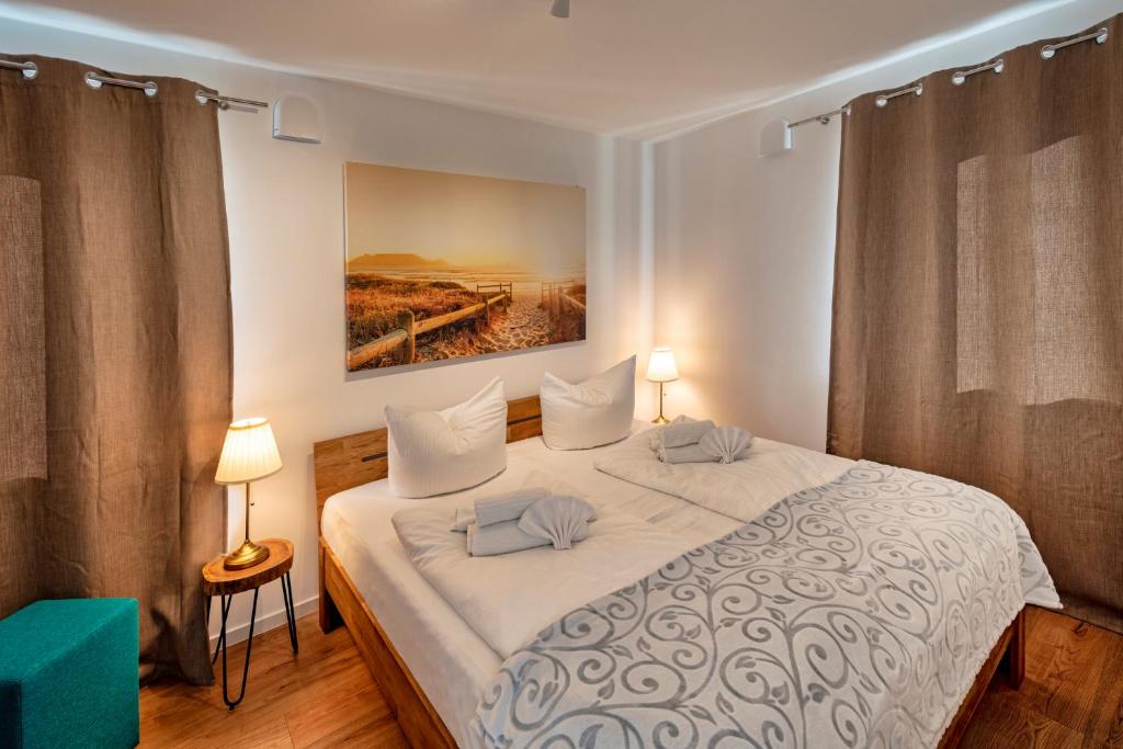 In unserer Apartmentanlage, im Jahr 2020 neu erbaut, befinden sich 5 individuell gestaltete und hochwertig eingerichtete Ferienwohnungen. Das Apartment SANDBURG verfügt über einen großen Wohnbereich mit Zugang zur Terrasse sowie eine offene, voll ausgestattete Küche (Küchenutensilien, Toaster, Kaffeemaschine, Wasserkocher, Mikrowelle, Spülmaschine, Kühl-Gefrierkombination, Cerankochfeld, Backofen, integrierte Waschmaschine). Zur Verfügung steht Ihnen ein Schlafzimmer mit einem massiven und komfortablen Doppelbett, Kleiderschrank und Regal sowie ein Bad mit einer ebenerdigen Dusche. Breite Türen sorgen für mehr Komfort Direkt an der Unterkunft steht ein reservierter und kostenloser Parkplatz zur Verfügung.
