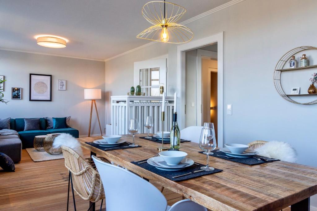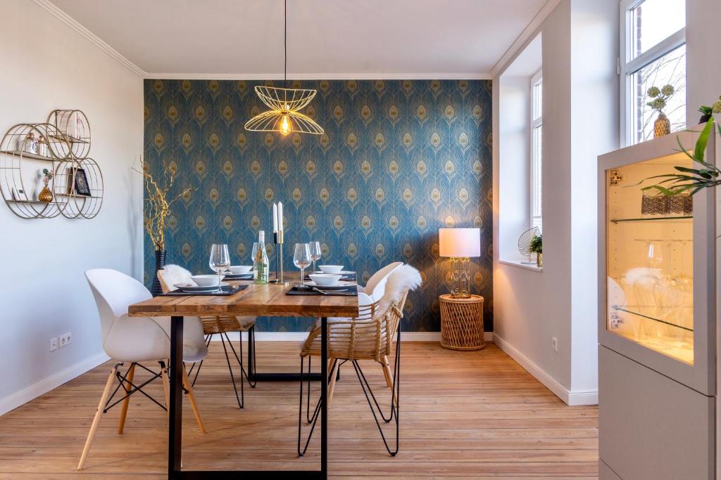 Willkommen in unserer frisch renovierten Gästewohnung "Suite 73". Die Wohnung befindet sich im 1. Obergeschoss einer restaurierten Altbau-Villa aus dem Jahre 1925 und verteilt sich auf ca. 110 m² über 2 Ebenen. Wir haben die Wohnung liebevoll im Einrichtungsstil Boho-Chick-Modern ausgestattet und darauf Wert gelegt, dass sich unsere Gäste auch längere Zeit wohlfühlen können. Wir können bis zu 4 Gäste beherbergen. 1 Schlafzimmer mit großem Boxspringbett (180x200 cm) und 1 Schlafzimmer mit einem kleineren Bett (140x200 cm) stehen unseren Gästen zur Verfügung. Die Einbauküche ist voll ausgestattet, sodass Sie es sich auch hier schmecken lassen können. Auch technisch bleiben in dieser Wohnung keine Wünsche offen; Fernseher in Wohn- und Schlafzimmern, freies W-LAN und ein Netflix-Zugang sind vorhanden. Die Dachterrasse bietet Ausblick über den aufwändig angelegten Garten. Wohn- und Esszimmer liegen an einer stark befahrenden Straße, die bei geschlossenem Fenster und nachts kaum zu hören ist.