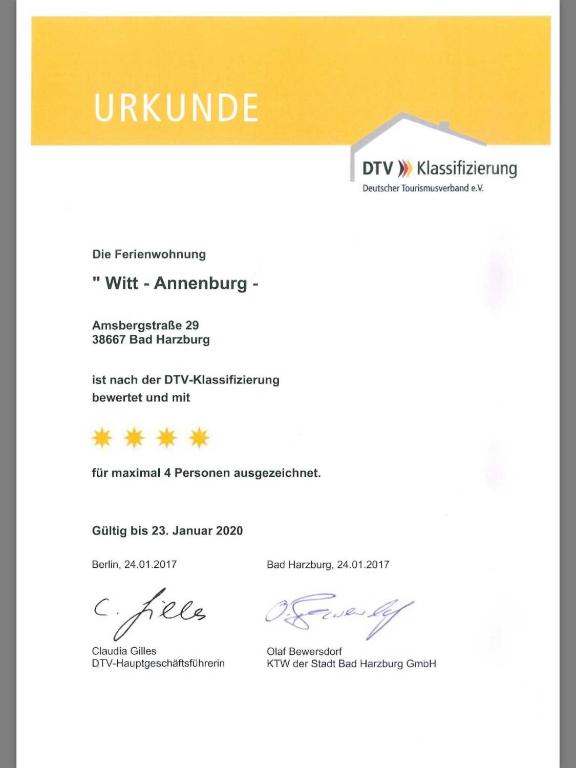 4-Sterne (DTV) Ferienwohnung in Bad Harzburg. <br/> Die modern und komfortabel eingerichtet Wohnung <br/> befindet sich in einem wunderschönen alten Haus <br/> mitten im Villenviertel und liegt sehr zentral nur wenige Gehminuten<br/> von der Bummelmeile, dem Kurpark, der Seilbahn ....<br/>  <br/> Hier verbinden sich das historische Gebäude und das moderne Interieur.<br/>  <br/> Vom Turmzimmer der Wohnung im 2. OG haben Sie eine wunderbaren über die ganze Stadt und die Seilbahn zum Burgberg.<br/> Nachts sieht man die hell erleuchtete Canossasäule auf der Spitze des Burgbergs.<br/>  <br/> Von hier aus starten Sie alle Ihre Aktivitäten, Ausflüge, Spaziergänge und Wanderungen oder bleiben einfach ' mal entspannt "Zuhause".<br/>  <br/> Die FeWoBad-Harzburg bietet Ihnen eine komfortable Umgebung in angenehmer Atmosphäre dafür.<br/>  <br/> Fühlen Sie sich einfach wohl.<br/>  <br/> Unsere Highlights sind vielfältig und überall sind viele schicke Details zu finden.<br/>  <br/> Unser Turmzimmer bieten Ihnen als Esszimmer und Kommunikationspunkt <br/> neben einer grandiosen Aussicht auf Bad Harzburg und den Burgberg,<br/> einen 2 Meter langen Granittisch und Platz für 6 Personen.<br/>  <br/> Im Wohnzimmer befindet sich eine Relaxcouch, mit der Sie motorisch die Sitz- u d Relaxfläche individuell Ihren Bedürfnissen anpassen können.<br/>  <br/> Dort ist auch ein 45 Zoll großes Flat-TV mit Telekom-Entertain in HD-Qualität.<br/> Oder Sie schauen Ihre mitgebrachten CD' s und Blue-Rays mit dem Player.<br/>  <br/> Den Lichteinfall regulieren Sie über weiße Doppelrollos nach Ihren Wünschen..<br/>  <br/> Es stehen Ihnen 2 Schlafzimmer zur Wahl.<br/>  <br/> Beide sind gleich gut mit 180x200 cm Boxspringbetten, Flat-TV, innovativer und stimmungsvoll dimmbarer LED-Beleuchtung sowie auf Wunsch abdunkelnder Doppelrollos ausgestattet.<br/>  <br />