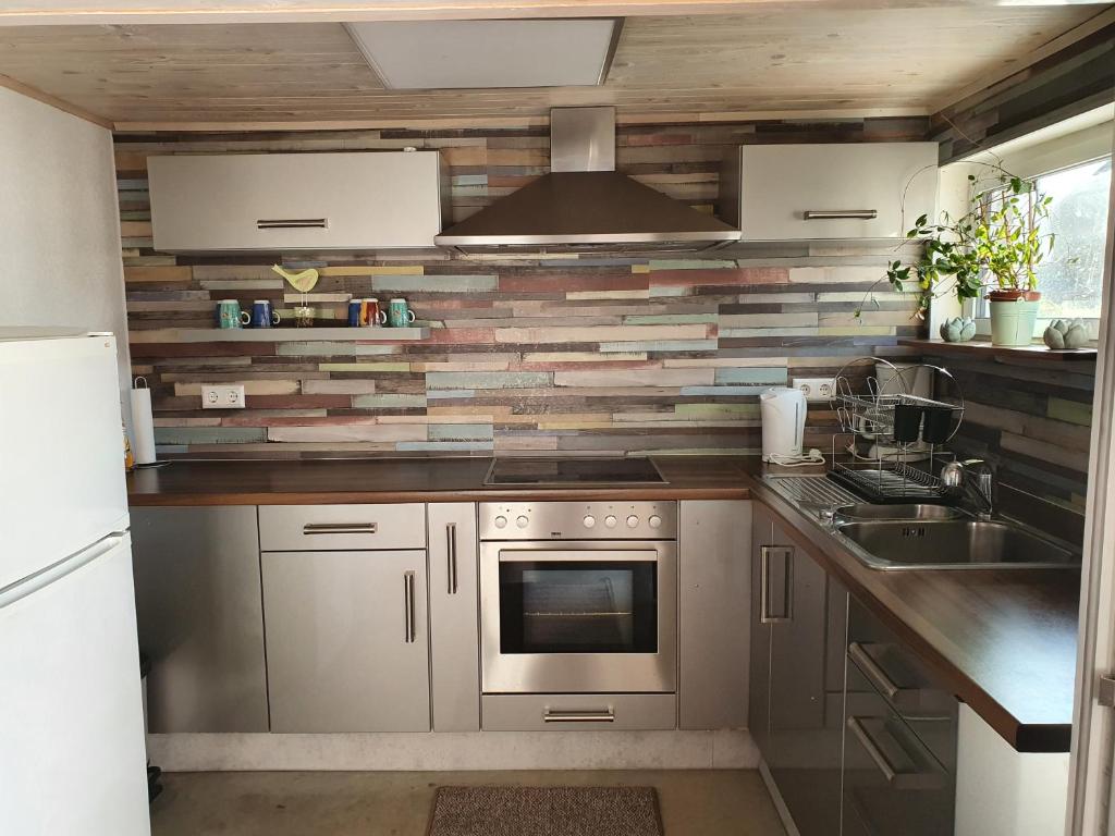 Die Küche ist mit einem Kühlschrank, einer Mikrowelle, einem Kochfeld und einer Kaffeemaschine ausgestattet.