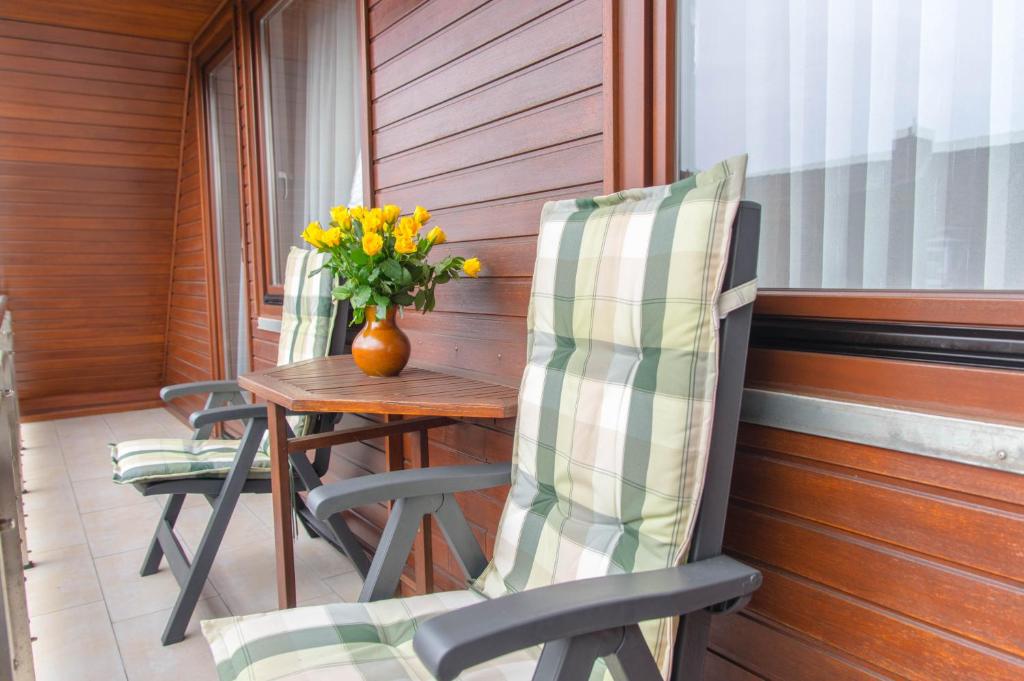 Die Ferienwohnung besteht aus einem Wohnraum mit Küchenzeile, separatem Schlafzimmer, Flur, Duschbad und Balkon. Sie ist modern und komfortabel eingerichtet. Flachbild TV, Radio/CD und WLAN-Zugang. Im Küchenbereich befinden sich Toaster, Wasser- und Eierkocher sowie eine Kaffeemaschine. Den Föhn finden Sie im Badezimmer.
