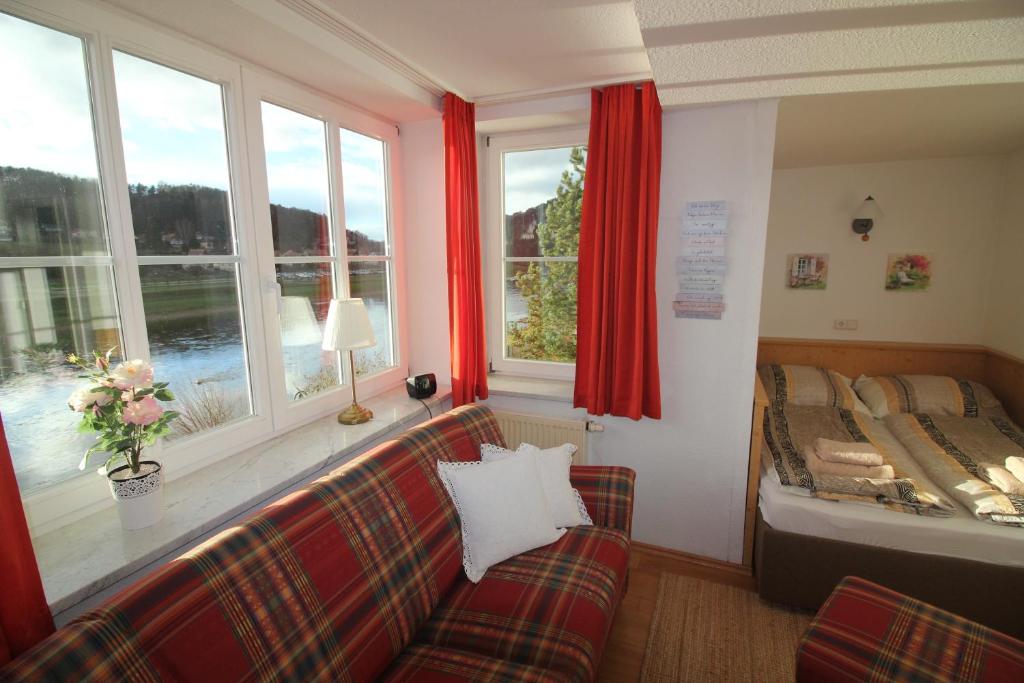 Die Villa Belvedere-Haus Elbblick liegt wunderbar gelegen in der ersten Reihe an der Elbe. Die Villa hat 6 wunderschöne Appartements mit einem einzigartigem Blick ins Elbtal und die Felsenpartie unterhalb der berühmten Bastei. Ebenso bekommt der Gast einen wunderbaren Blick auf den imposanten Tafelberg Lilienstein. Das Haus liegt in leichter Hanglage, es führen, wie fast überall im Ort, einige Stufen hinauf zum Haus. Die Zimmer sind im Landhausstil gehalten und vermitteln eine gemütliche Behaglichkeit. Die Appartements bestehen aus einem Wohn/Schlafraum für 2 Personen mit der Möglichkeit einer Aufbettung. Die ca. 1,60m großen Betten befinden sich in einer angelegten Schlafnische. Es gibt ein gesondertes Duschbad, in einem Appartement eine Badewanne. Ebenso eine kleine Küche, entweder als gesonderten Raum oder als Küchenzeile integriert. Ein Appartement hat einen Balkon. Für alle Appartements stehen 3 Terrassen, natürlich mit Elbblick, zur Verfügung. Dort finden Sie Gartenmöbel zum Entspannen nach einem ausgiebigen Wandertag. Auch können Sie dort Ihr Frühstück einnehmen. Wir stellen Ihnen ohne Aufpreis Bettwäsche und Handtücher .