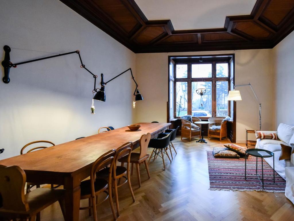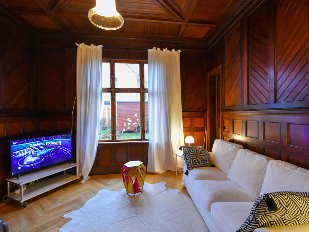 Mit den historischen Wandverkleidungen aus Pitchpineholz, zeigt das kleinere Wohnzimmer, Fernsehraum und Biblliothek den ganzen Charme der alten Bäderarchitektur. Das große Esszimmer und die Veranda bieten durch einen Erker Ostseeblick nach Nordost und Zugang in den vorderen Bereich des Gartens. Dort steht ein rustikaler Saunawagen der gerne genutzt werden kann. Neben dem Saunawagen steht ein kleines Nebengebäude, indem die Waschmaschine und eine weiter Toilette untergebracht ist. Ebenfalls im Erdgeschoss befindet sich die große Küche mit Sitzgelegenheit und Blick in den sehr großen Garten. Dort kann man noch den alten Baumbestand, Ginko, Eibe, Hängebuche, genießen und in der Hängematte oder den Liegestühlen entspannen.