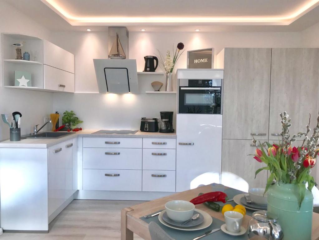 Unsere schönen 2-Raum-Appartement mit ca. 30 m² Wohnfläche befindet sich im Erdgeschoß des Hauses und sind für bis zu 2 Personen ausgelegt. In dem hellen, freundlichen Wohnraum finden Sie eine bequeme Couch, einen Flachbild-TV und einen Esstisch vor. Die harmonisch in den Wohnbereich integrierte Küchenzeile ist mit einem Kühlschrank mit Gefrierfach, einem 4-Platten-Cerankochfeld, einer Geschirrspülmaschine, einem Backofen mit Mikrowellenfunktion, Wasserkocher, Kaffeemaschine, Toaster und diversem Kleininventar ausgestattet. Komfortabel geht es auch im Schlafzimmer zu. Das bequeme Boxspringbett (1,80 x 2 m) sowie das benachbarte moderne Duschbad mit WC lassen keine Wünsche offen. Ein Internetanschluss per W-LAN steht Ihnen ebenfalls zur Verfügung, außerdem auf Wunsch ein eigener PKW-Stellplatz auf dem Grundstück. Unsere Nichtraucher-Appartements sind das ideale Urlaubsdomizil für 1 - 2 Personen. Herzlich willkommen!