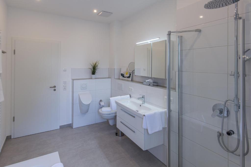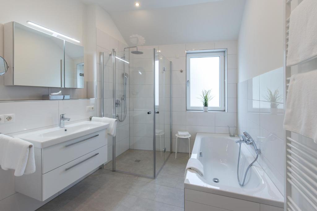 Unser großzügiges Penthaus im Stadtzentrum der im Ahrtal gelegenen Kurstadt Bad Neuenahr-Ahrweiler lädt Sie zum Erholen und Genießen ein. Durch den hauseigenen Aufzug können Sie das Penthouse im 4. Obergeschoss des Objektes bequem und barrierefrei erreichen. Die Terrassen sprechen mit ihrer Ost- und Südwestauslegung ganztägig zum Sonnenbaden an. Mit zwei Schlafzimmern, zwei Bädern und einem “loftartigen” Wohnbereich mit integrierter Einbauküche ist die Wohnung für eine Belegung mit vier Personen ideal geeignet. Für weitere Gäste bietet das vollwertige Schlafsystem, welches im Sofa des Wohnzimmers integriert ist, zwei weitere Übernachtungsmöglichkeit an. Das Bett im Hauptschlafzimmer weißt eine Größe von 180cm x 200cm auf, das Bett im Nebenschlafzimmer sowie das Schlafsofa im Wohnbereich weisen eine Größe von 160cm x 200cm auf. Die Bäder sind jeweils mit einer verglasten und ebenerdigen Duschkabine, sowie Waschbecken und Toilette ausgestattet. Darüber hinaus bietet Ihnen das Hauptbadezimmer eine Badewanne samt Handtuchheizung und zusätzlichem Urinal an. Unsere Wohnungen werden mit Bettwäsche, Handtüchern und Bademäntel an unsere Gäste übergeben. Weiterhin legen wir großen Wert