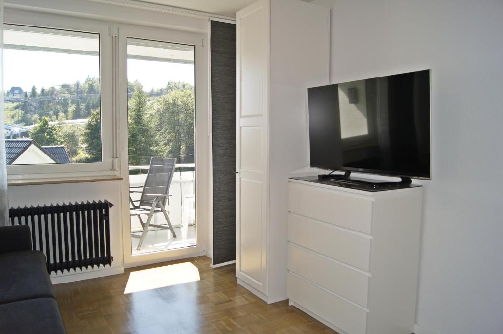 Dieses Apartment verfügt über einen Balkon, ein Wohnzimmer und einen Flachbild-TV.