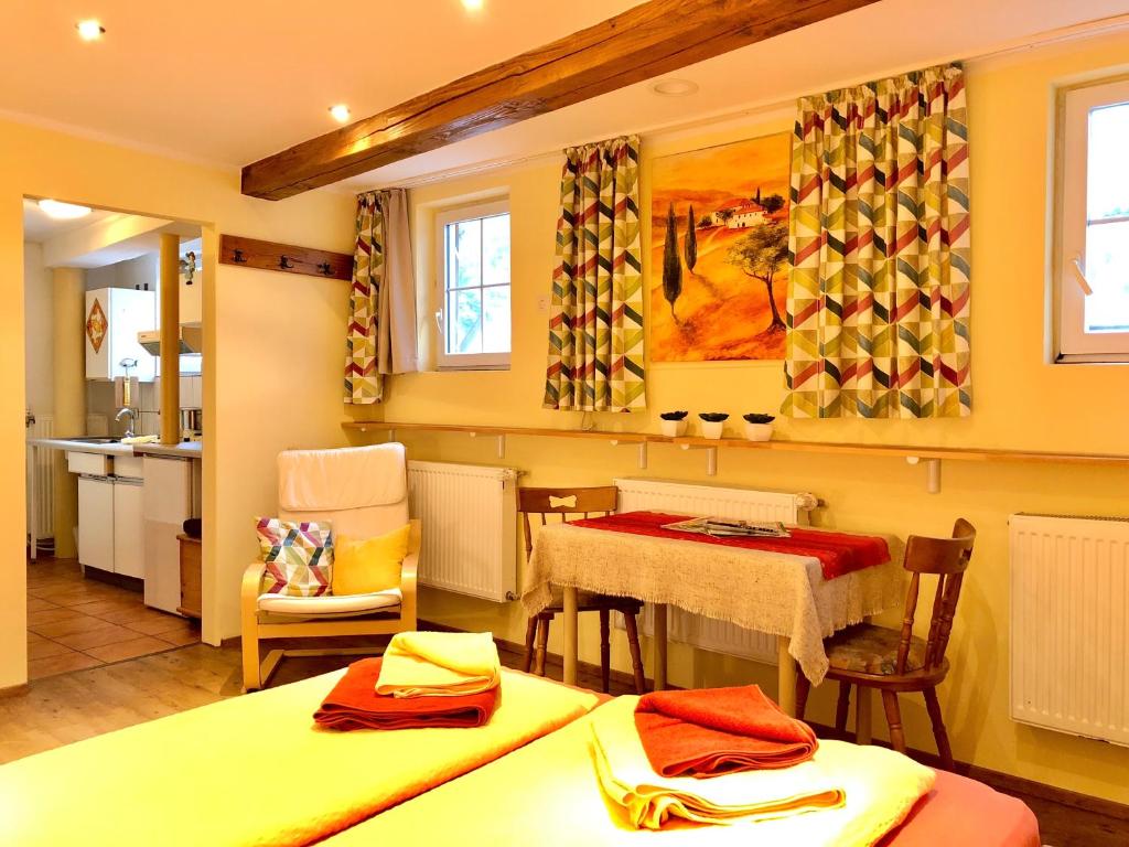 Die Wohneinheiten in der Pension verfügen über einen Sitzbereich, einen Flachbild-Kabel-TV, eine Küchenzeile, einen Essbereich und ein eigenes Bad mit einem Haartrockner und einer Dusche. Einige Unterkünfte im Zum fröhlichen Weinberg bieten Bergblick und die Zimmer sind mit einer Kaffeemaschine ausgestattet. Jedes Zimmer in der Unterkunft verfügt über Bettwäsche und Handtücher.